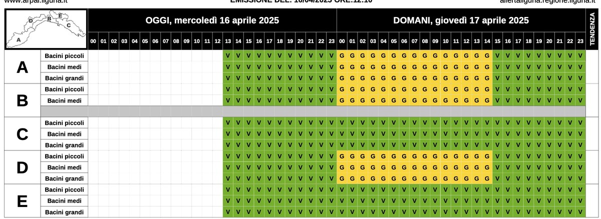 "Un profondo minimo depressionario sul mar Ligure porta piogge diffuse, con cumulate elevate su AD e significative su BCE, piogge di intensità moderate su AD. Alta probabilità di temporali forti e/o organizzati su ABD, bassa probabilità di fenomeni forti su CE, con possibili danni puntuali legati a rovesci di forte intensità e colpi di vento. Venti in rinforzo da Sud-Est fino a burrasca forte su BC e burrasca su E, in rinforzo da Nord-Est fino a burrasca forte su A e burrasca su D. Mareggiate intense ovunque per onda lunga da Sud/Sud-Est."