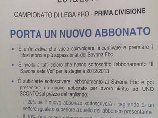 Si chiama: "Porta un nuovo abbonato". Ovvero, per tutti coloro che hanno aderito alla campagna dell'anno passato "Il Savona siete voi", se rinnoveranno l'abbonamento al Savona Fbc e presenteranno un nuovo abbonato avranno diritto ad UNO SCONTO sul prezzo del tagliando: