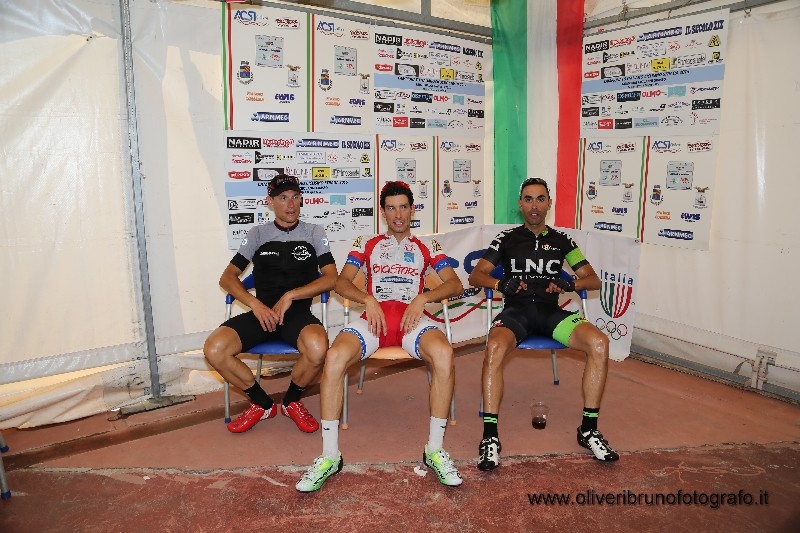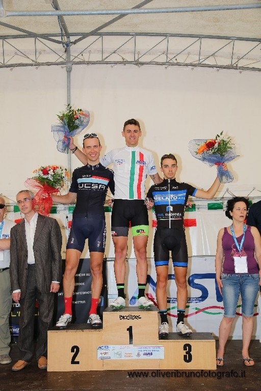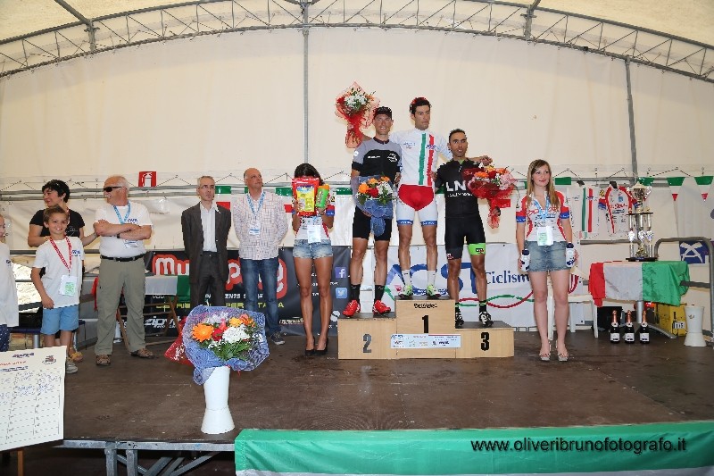 Il gruppo a questo punto faceva gara a se e i due fuggitivi raggiungono gli oltre tre minuti di vantaggio e si presentano al traguardo senza nemmeno sprintare, con un estremo gesto di sportività dell'atleta biellese Chocol lascia che sia l'atleta di casa Fabio Oliveri capitano della Bicistore a tagliare per primo il traguardo braccia al cielo a diventare campione italiano di categoria. Il gruppo arriva in volata a 2,40 dal vincitore e ad aggiudicarsi il gradino più basso del podio è il mantovano Simone Storace. Impressionante la media dei due che hanno percorso gli 84 km in 1h e 58' alla media di km42,400.