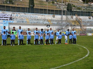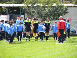Le squadre entrano in campo in questo momento scortate dai bambini del settore giovanile matuziano. Importante la cornice di pubblico presente all'evento, nonostante l'orario pomeridiano infrasettimanale