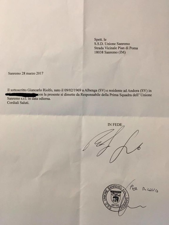 "La Sanremese Calcio rende noto che, in data odierna, l’allenatore della prima squadra Giancarlo Riolfo ha rassegnato le proprie dimissioni. La guida tecnica della prima squadra passa all’allenatore in seconda Alberto Baldisserri e al preparatore dei portieri Gianni Minori".