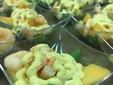 I pesci presenti sono i gamberi, l’aragosta, le ostriche, l’ombrina e gli scampi, la verdura invece comprende la barbabietola rossa, il broccolo romano, i funghetti sott’olio, l’uovo sodo e naturalmente una galletta del marinaio imbevuta di aceto.
