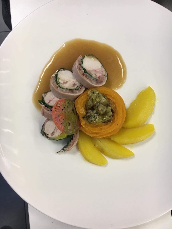 Fra i primi si può apprezzare, con pasta fresca fatta in casa, i ravioli di pesce e di carne e le fettuccine con ragù di lepre oltre agli gnocchi di patate con rana pescatrice e fiori di broccoli; nei secondi si può trovare il fritto misto del golfo, il cappon magro, i calamari ripieni, l’aragosta alla piastra, e come proposta non di pesce il coniglio ripieno e il brasato al barolo.