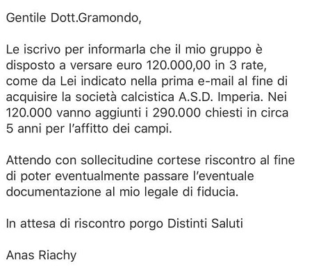 Nella gallery la mail con la proposta di Riachi per l'acquisto dell'Imperia Calcio.