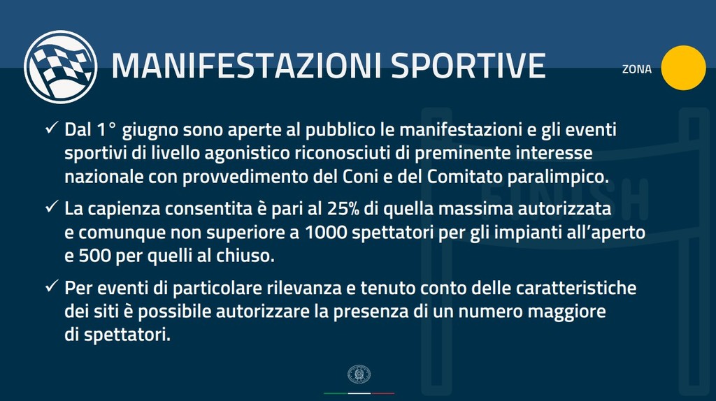 Eventuali deroghe saranno consentite per determinati eventi e impianti (soprattutto in ottica dei Campionati Europei di calcio e delle grandi competizioni internazionali).