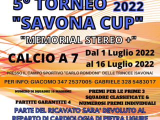 Manca sempre meno all’inizio della 5° Savona Cup, il torneo di calcio a 7 diventato per l’occasione “Memorial Stereo +” che si disputerà dall’1 al 16 luglio.