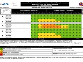 Arpal ha emesso l'allerta gialla e arancione per temporali e piogge diffuse sulla Liguria. Questa la situazione per le prossime ore: allerta gialla idrologica e per temporali dalle 18 di oggi, giovedì 26 ottobre, sulle zone B, C, E (centro, levante e versanti padani di levante). Seguirà l'allerta arancione sulla zona C dalle 21 di oggi, sui bacini piccoli fino alle 6 e sui medi e grandi fino alle 10 di domani, venerdi’ 27 ottobre. Allerta gialla fino alle 15 sui bacini medi e grandi della zona C.