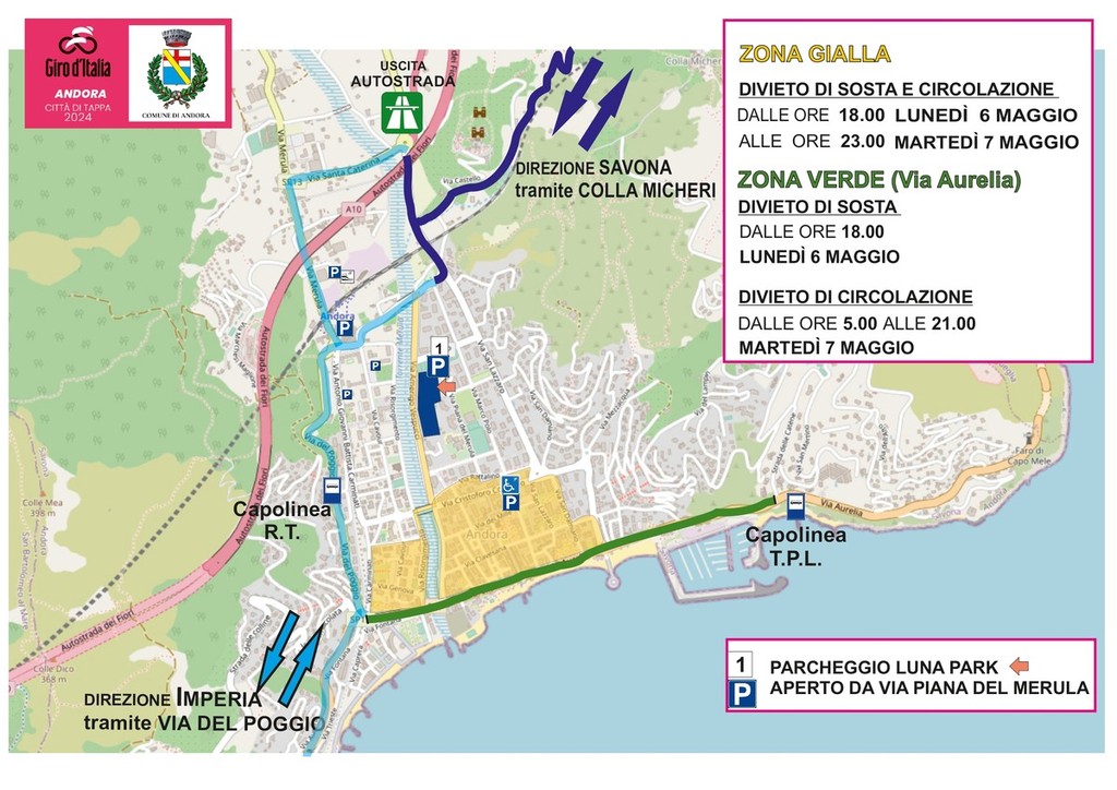 “Siamo arrivati a definire questo piano del traffico cittadino, che risponde alle esigenze fatte dagli organizzatori e alle garanzie di sicurezza per gli andoresi, il numeroso pubblico, gli atleti e di tutta la carovana rosa. Stiamo lavorando in piena sinergia e supporto di Prefettura, Questura, 118 Anase aziende di trasporto pubblico locale TPL ed RT.Presentiamo una mappa di Andora dove con zone colorate che indicano gli orari di divieto – ha annunciato il Vice sindaco Paolo Rossi che ha seguito tutta la fase organizzativa dell’arrivo della quarta Tappa del Giro – Ci rendiamo conto che si tratta di provvedimenti significativi, ma necessari per avere nel nostro paese una gara così importante di carattere internazionale. In ogni istante e in ogni punto del paese sarà garantito soccorso sanitario e tecnico. Consigliamo anche vivamente a tutti di spostare le auto dalle autorimesse private prima che scattino i divieti. Per tutta la prossima settimana continueremo a informare compiutamente la cittadinanza per fare in modo che il piano sia compreso e rispettato”.