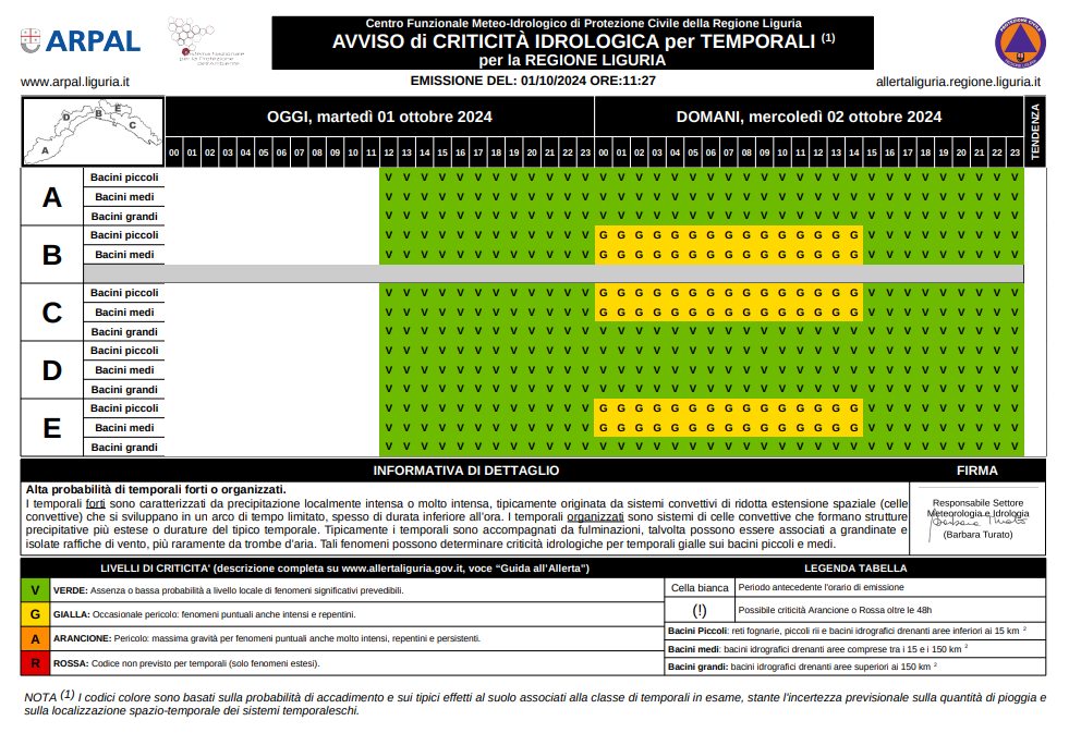 Per oggi bassa probabilità di temporali forti sulle zone BCDE Come previsto, il flusso umido da sud-ovest già presente sulla Liguria nella giornata odierna anticipa il peggioramento che investirà la nostra regione tra la serata di oggi e domani, mercoledì 2 ottobre.