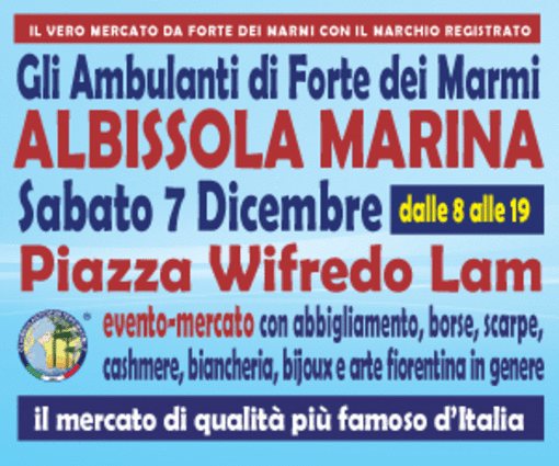 Gli Ambulanti di Forte dei Marmi: le bancarelle del mercato di qualità più famoso d’Italia tornano finalmente a grandissima richiesta nel Savonese con tutto il meglio del Made in Italy artigianale e le ultime tendenze della moda. Si potranno infatti ammirare le ormai mitiche “boutique a cielo aperto” dell’originale Consorzio, per un attesissimo ritorno, sabato 7 dicembre ad ALBISSOLA MARINA, in Piazza Wifredo Lam. Dunque, un appuntamento da non perdere assolutamente per i tanti appassionati del genere che lo hanno reclamato a lungo, come sempre all’insegna dello shopping più glamour e conveniente, con orario continuato, anche in caso di maltempo, dalle 8 alle 19.