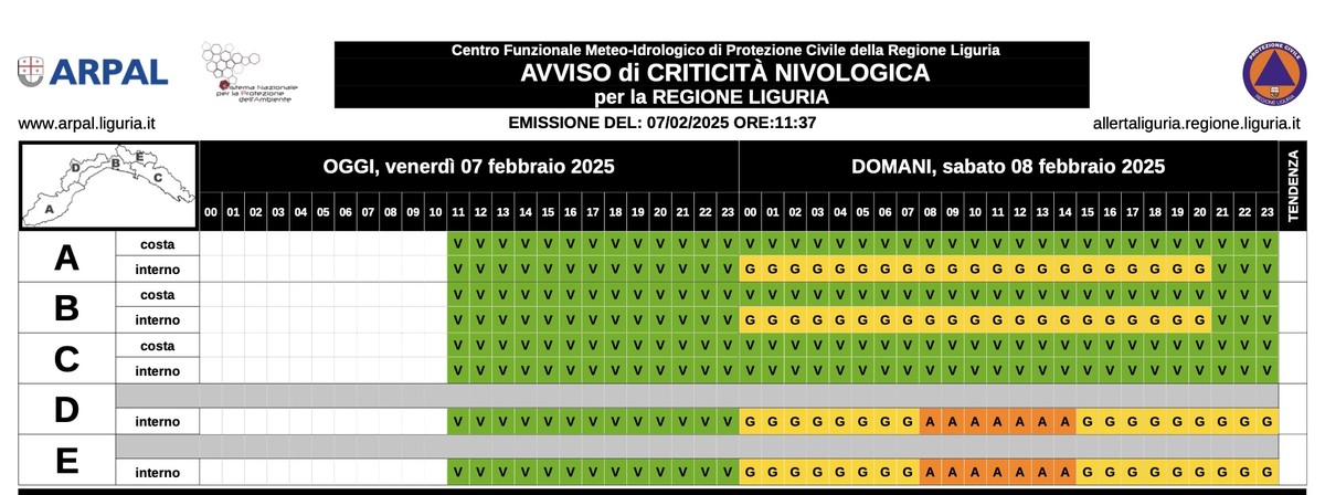 Precipitazioni diffuse anche nevose con nevicate anche moderate (accumuli compresi fra 10-20 cm in 12 ore) su DE e interno di AB: quota neve fino al suolo su D e parte occidentale di E. Nevicate deboli fino a 400-500 metri su interno B parte centro-occidentale, sopra i 1000 m su interno B orientale e interno A, sopra 800- 1000 m E parte orientale, spolverate sopra 1000-1200 metri interno C. Possibile locale gelicidio nell'interno del genovesato (Valle Scrivia, Val Trebbia). Venti forti settentrionali su AB, orientali moderati con rinforzi su C.