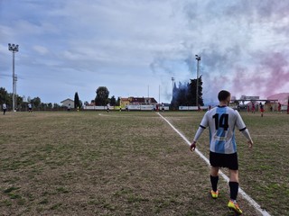 3' atmosfera veramente fantastica all'Ellena, tribuna gremita e tifo per entrambe le squadre. Classici fumogeni all'ingresso in campo per i rossoblu, fuochi d'artificio e fumogeni per i biancocelesti