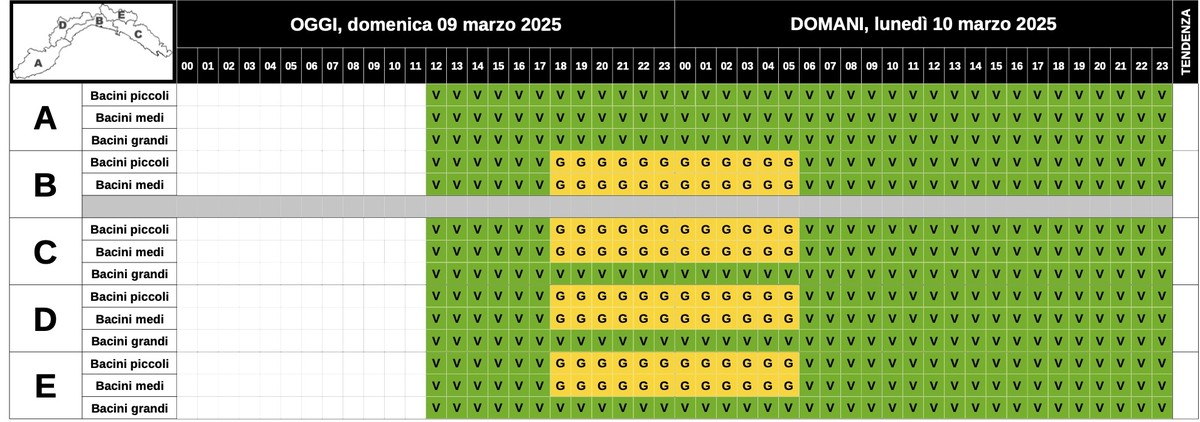 Allerta gialla per temporali sul centro levante della Liguria, zone BCDE dalle 18 di oggi, domenica 9 marzo, alle 6 di domani, lunedì 10 marzo.