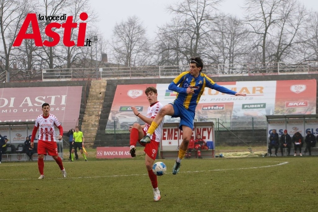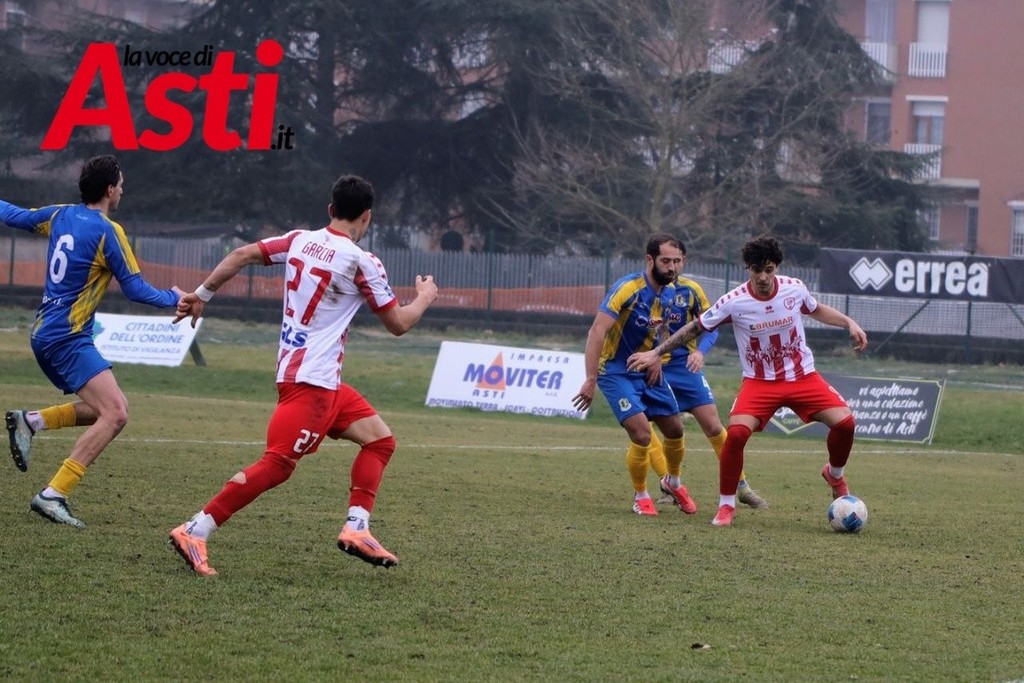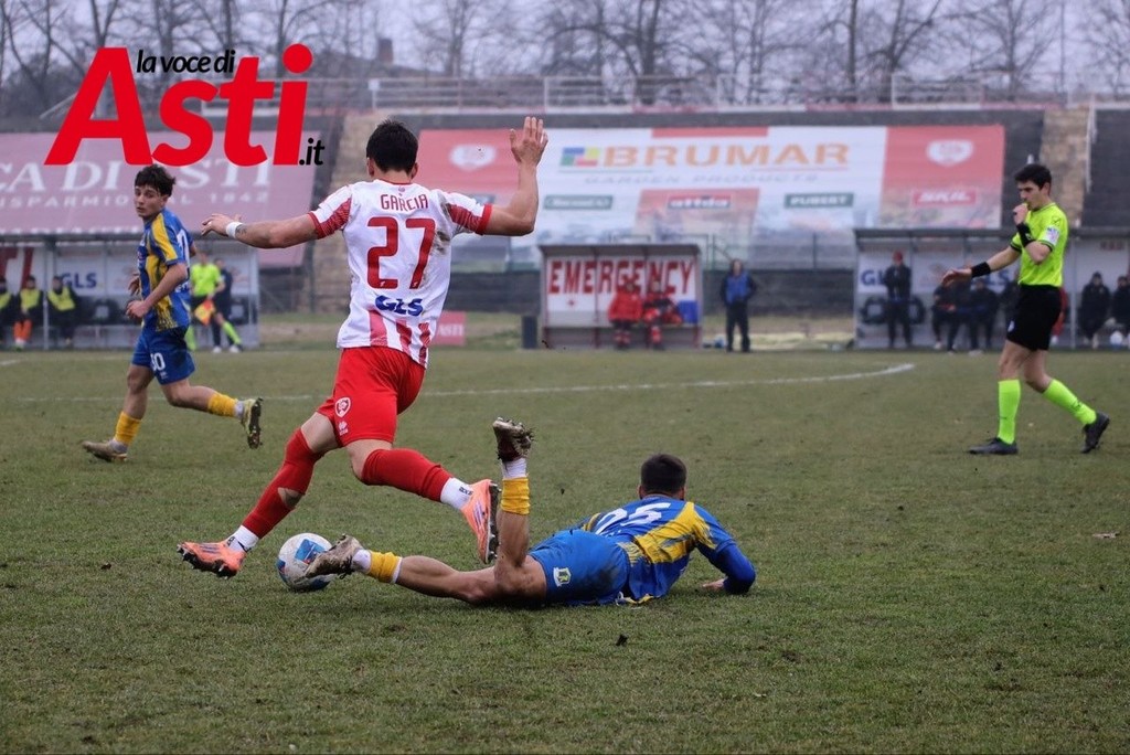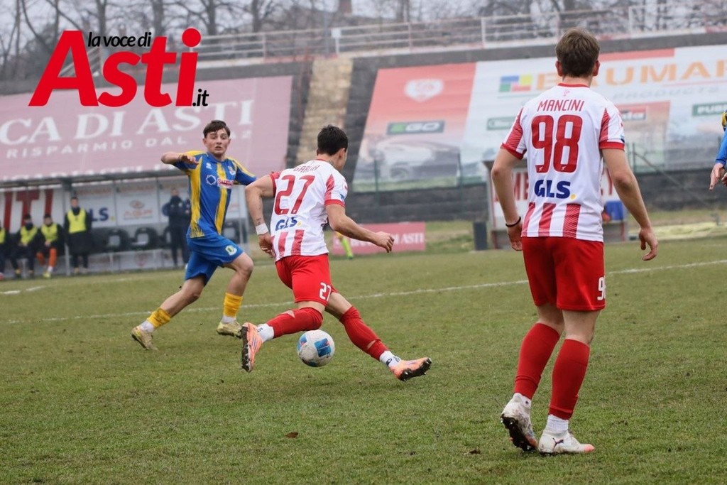 L’avvio è bloccato, spezzettato, con entrambe le squadre guardinghe. Dopo pochi minuti però arriva una notizia pesante per i biancorossi: Larotonda si accascia a terra ed è costretto al cambio, al suo posto entra Gatto. L’Asti prova comunque a costruire, soprattutto sulla sinistra con l’asse Ropolo–Podestà, e guadagna i primi calci d’angolo. Da una palla inattiva nasce la conclusione morbida di Mancini, facile preda di Ceppi.