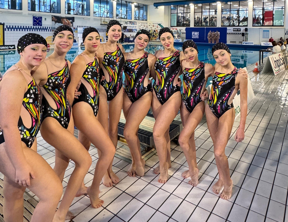 Poco dopo è stato il turno dell’esercizio di squadra, che ha visto impegnate Maddalena Attolini, Anita Bassani, Emmaluna Capelli, Letizia Dall’O, Viola Gattuso, Beatrice Illiano, Matilde Orso e Carlotta Varaldo. Nonostante un’imprecisione nella fase di spinta iniziale, il gruppo ha portato in vasca un esercizio energico e determinato, chiudendo al tredicesimo posto su 28 squadre partecipanti.